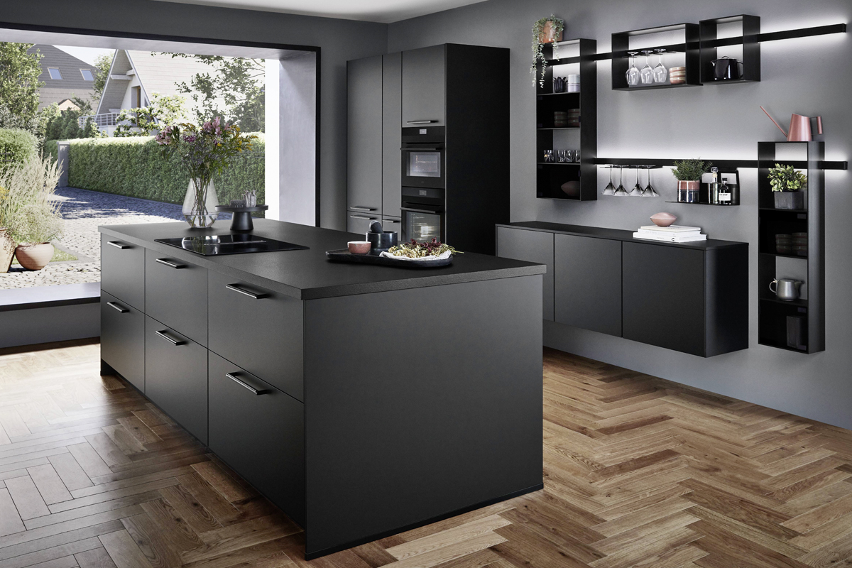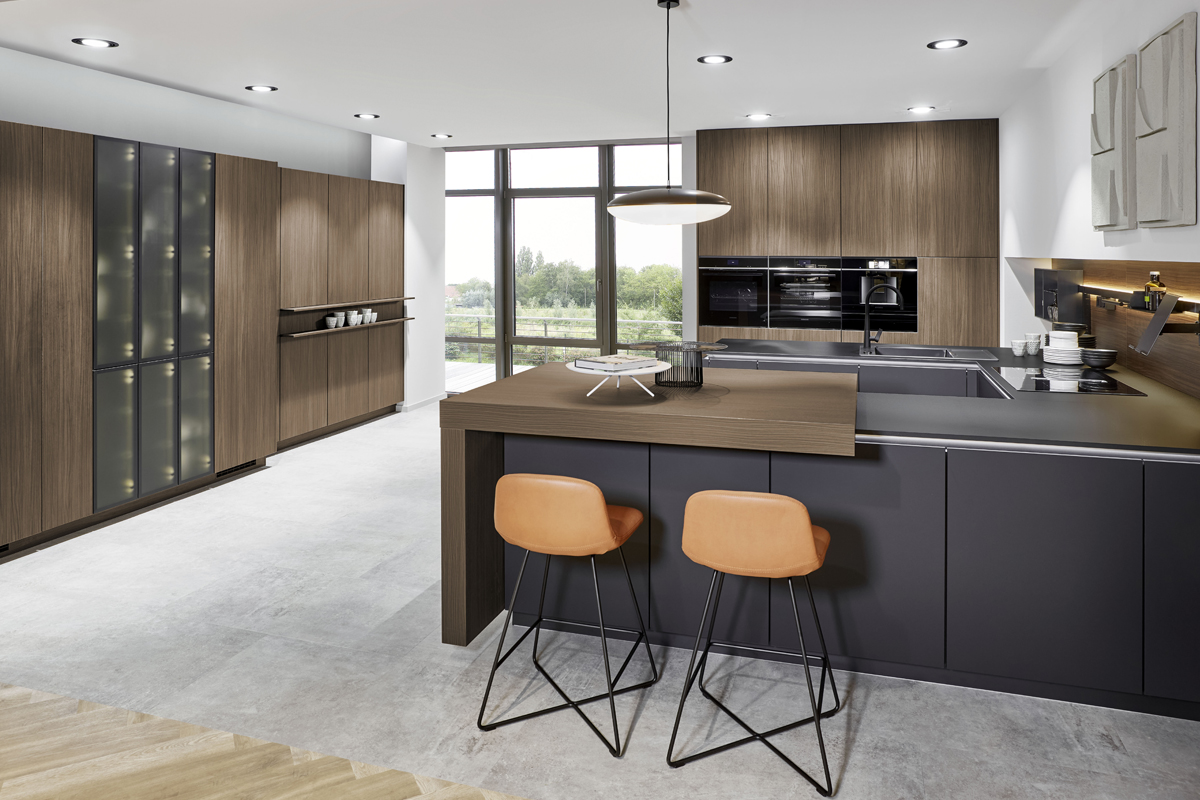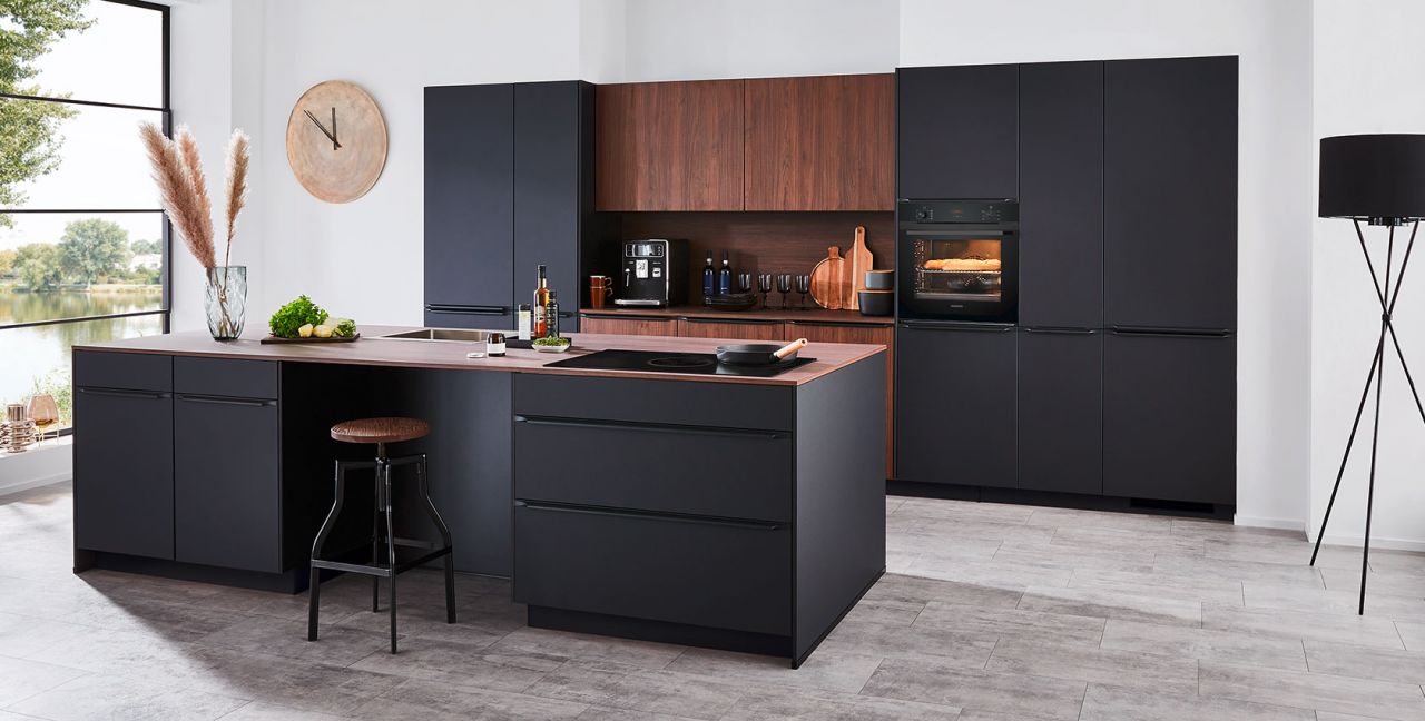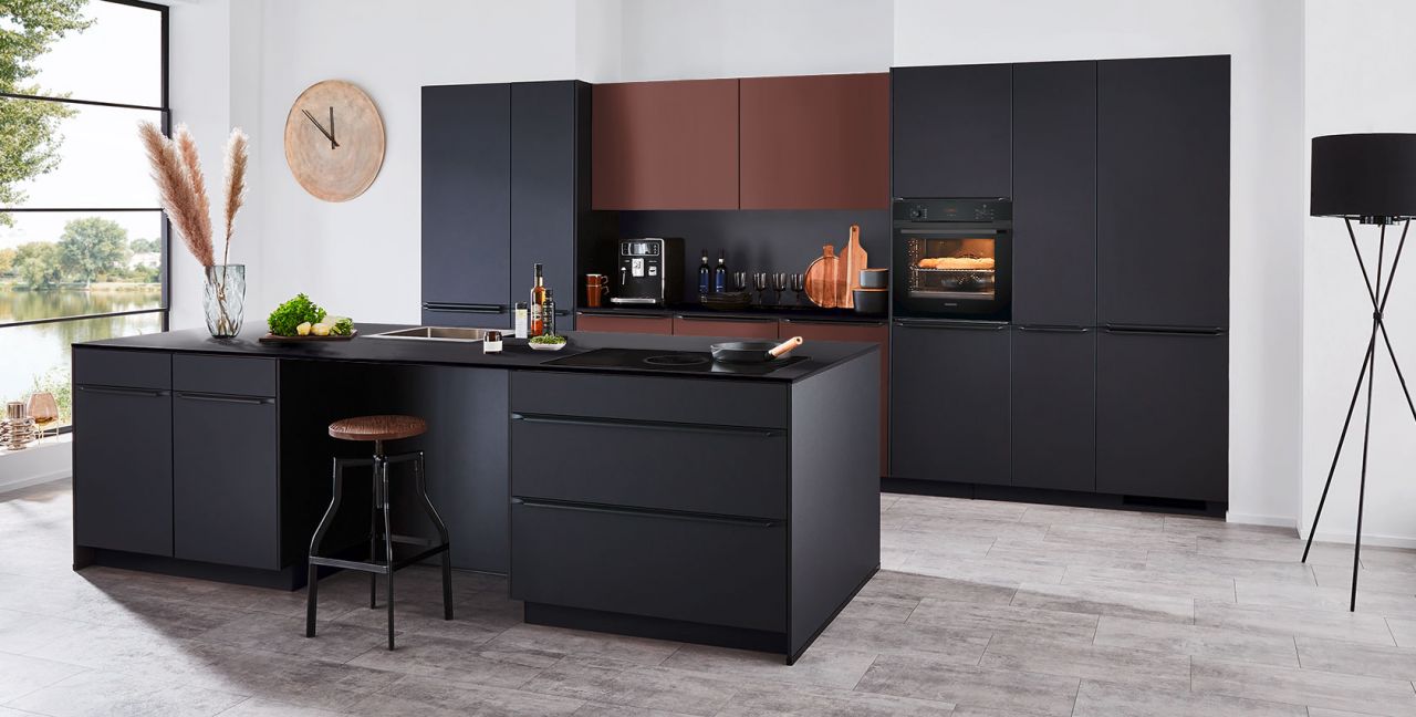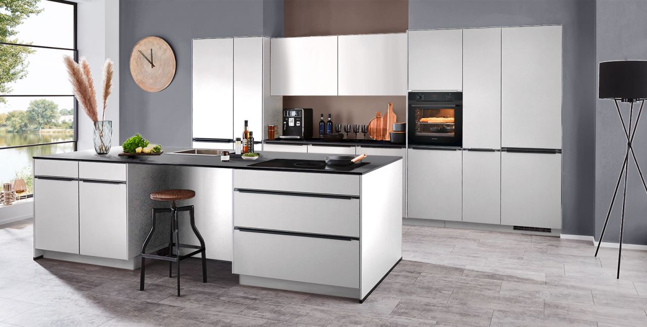 Inklusive Einbaubackofen schwarz Bosch HBA3340B0 Energieeffizienzklasse A, Glaskeramik Kochfeld Bosch PKE645BA2E, Kühlschrank Bosch KIR21NSE0 Energieeffizienzklasse E, Geschirrspüler vollintegriert Bosch SBV4HAX48E Energieeffizienzklasse D, Einbauspüle Edelstahl Rodi BOX LUX 57, XL-Schränken, Unterschrank mit Frontauszügen, Esstheke.
